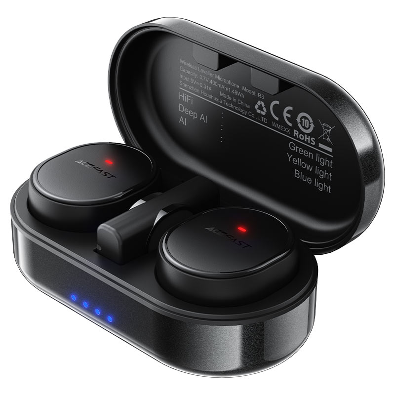 R3 має ультралегкий і компактний дизайн: кожен мікрофон важить лише 8 г, ресивер — 3 г, а весь комплект з кейсом — 64 г, що робить його ідеальним для подорожей, влогінгу, інтерв'ю чи стримінгу. Магнітне кріплення дозволяє швидко та надійно фіксувати мікрофони на одязі без кліпс чи дротів. Корпус виконаний з міцного ABS-пластику, стійкого до подряпин і щоденного використання. Зарядний кейс компактний (82 × 43 × 30 мм), зручно поміщається в кишеню чи сумку, забезпечує до 24 годин автономності. Мінімалістичний стиль AceFast — матовий чорний колір, елегантні форми та практичність — підкреслюють сучасність і професійність пристрою.